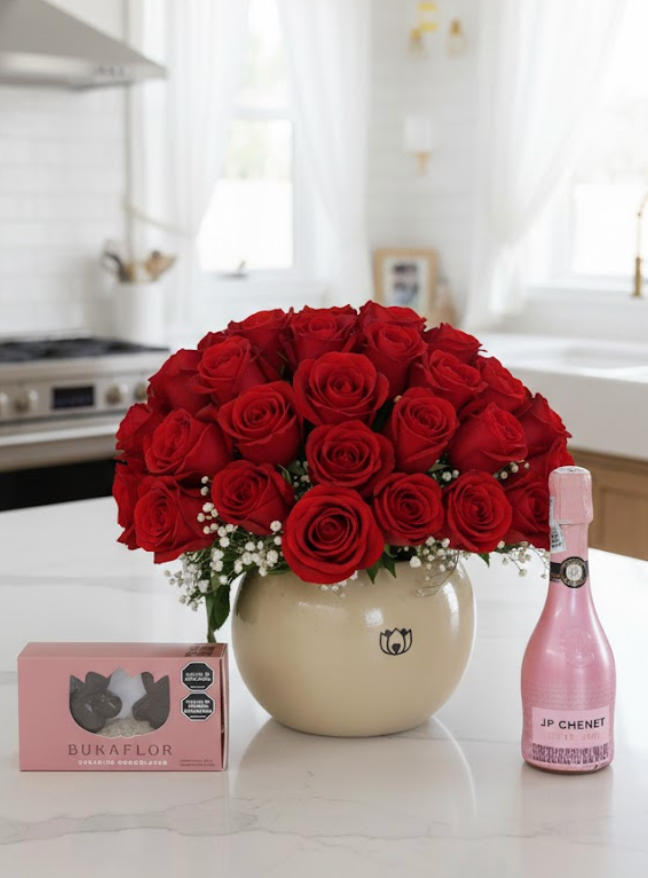 Rose Candy 💝 A gift that speaks for you: 60 roses, sweets, and a touch of elegance to surprise anyone from anywhere. Includes: 60 roses, choco-Bukkiteddy, JP Chenet champagne, 4 Ferrero, foliage, plastic pot and FREE card.
