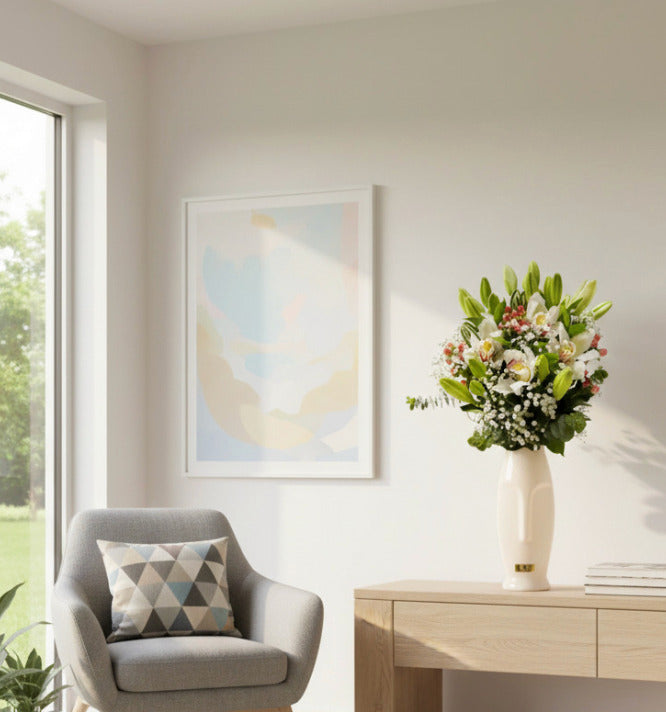 Contains: 💐 5 Orchids + 4 Lily Sticks 🌸 Astromelias, Gypsophila and wild foliage 🏺 1 Luxury “face” style or seasonal vase 🌿 Vitamins and care instructions 💌 FREE Card