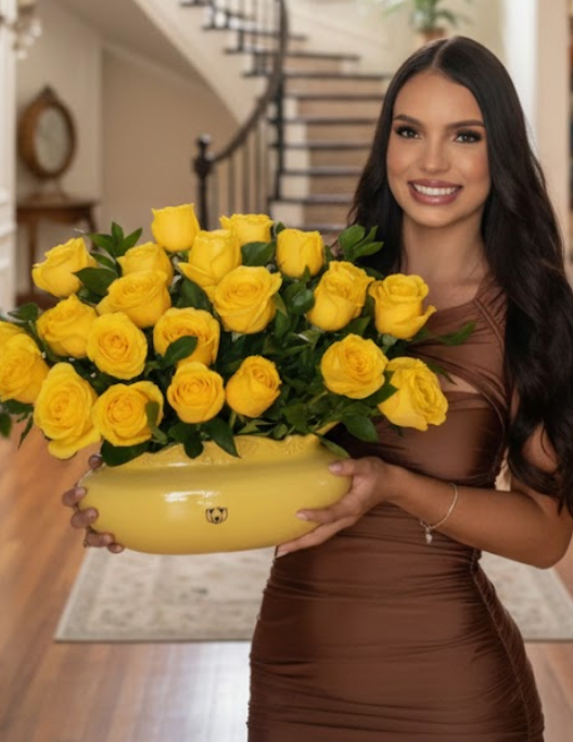 OUR TOP for Mother's Day in yellow roses, It is made with too much love, by hand, with a bright yellow color. Contains: * (1) HANDMADE CERAMIC VASE * (50) YELLOW ROSES * Decoration with seasonal wildflowers * Vitamins and care instructions. * 1 Clear Glass Vase. * FREE Card.