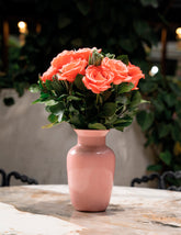 This is a floral bouquet made with salmon-colored roses. The warm orange-pink tones suggest a love for the natural look, the basics, enjoying family, friends, and the necessities of life without pretensions. It can subtly encourage us to express our emotions and generally increase...- $150.000,00