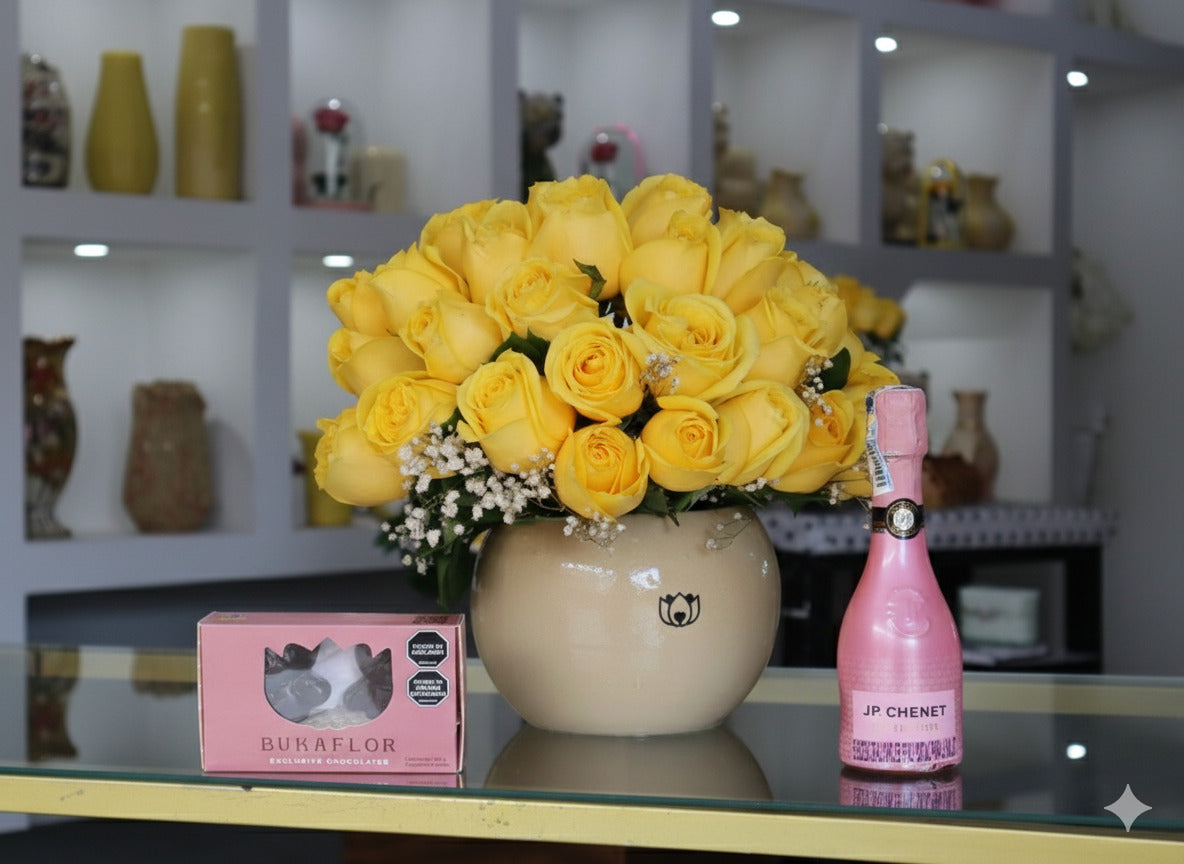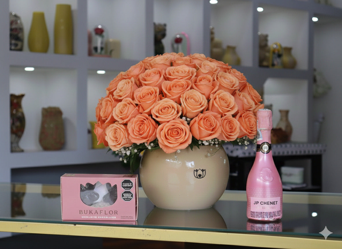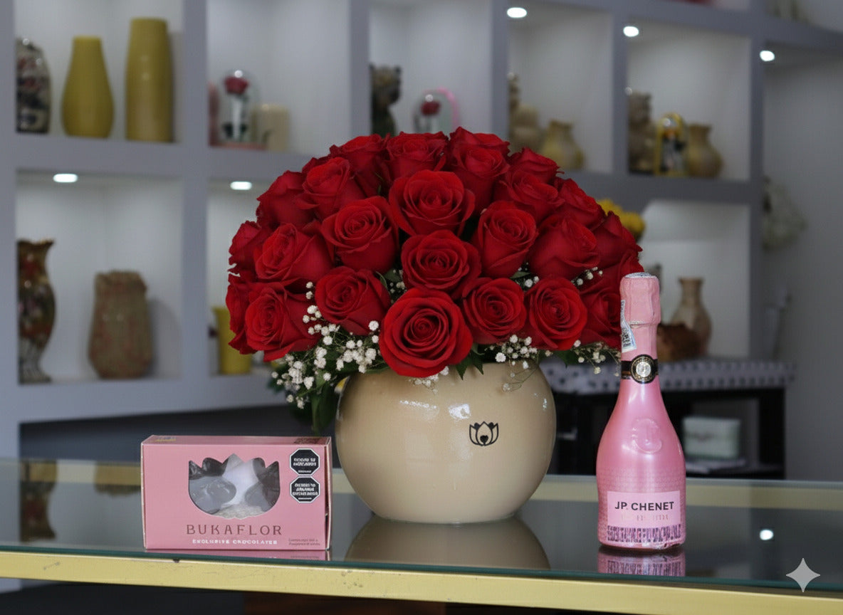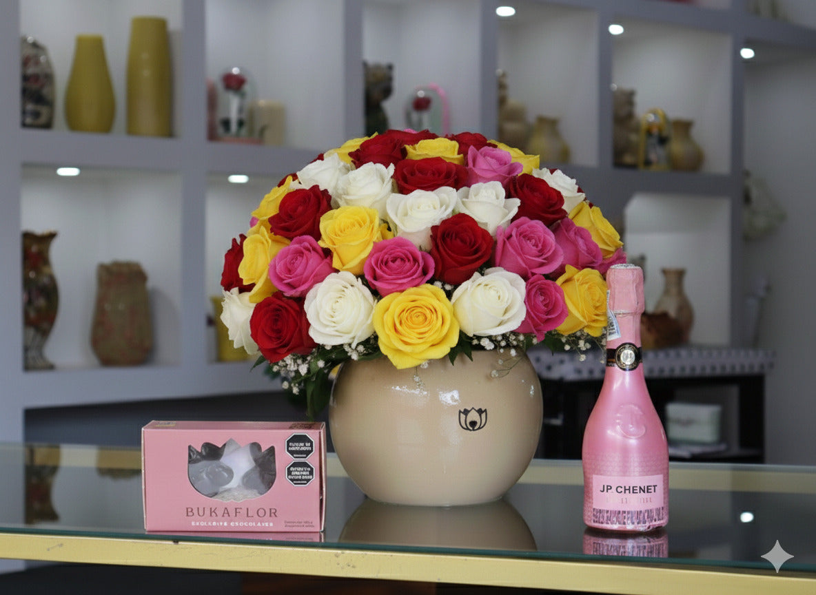 Bombón de Rosas 💝Un regalo que habla por ti: 48 rosas, dulces y un toque de elegancia para sorprender desde cualquier lugar. Incluye:60 rosas, champaña JP Chenet,  Chocobukkiteddys, follajes, matera plástica y tarjeta GRATIS.