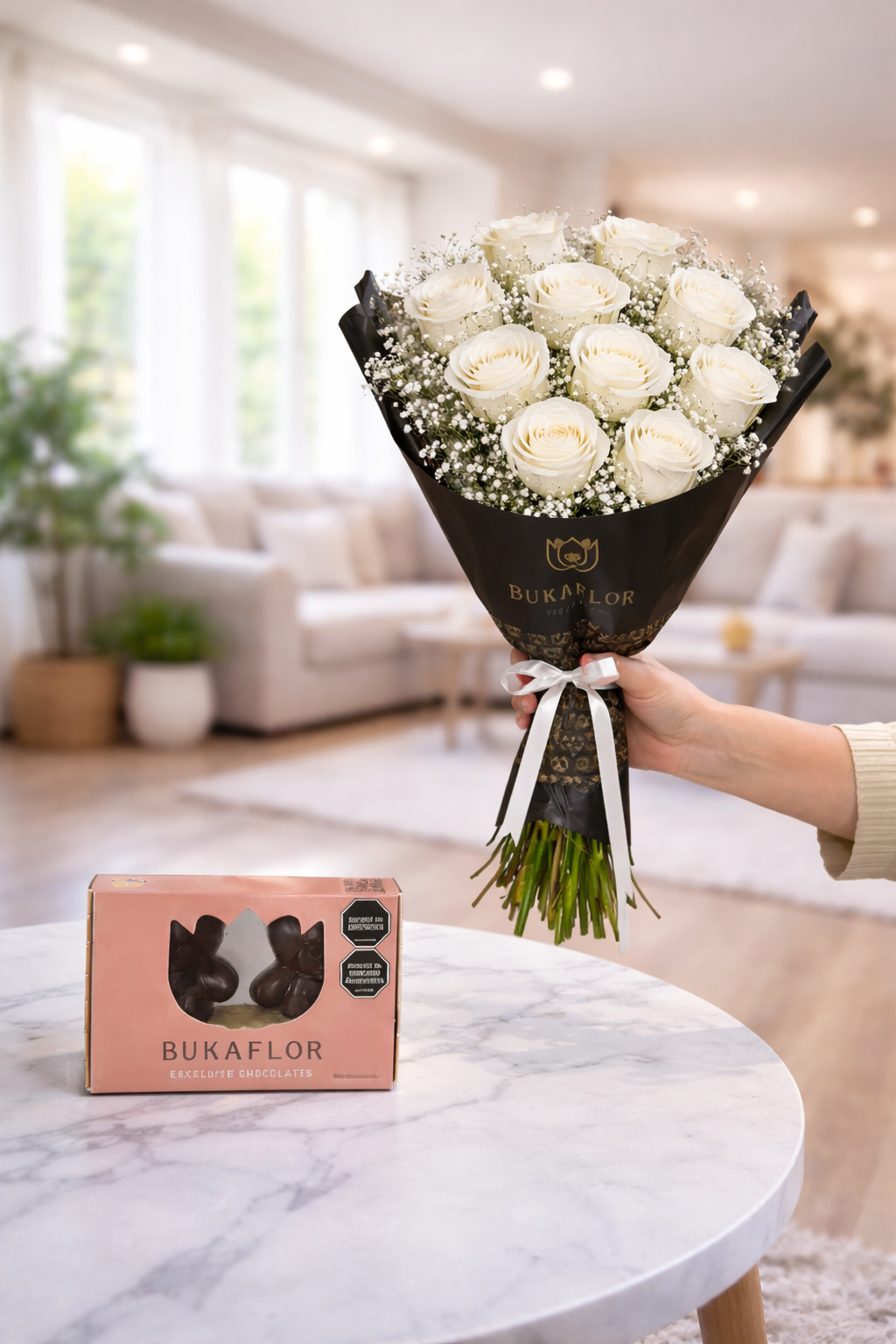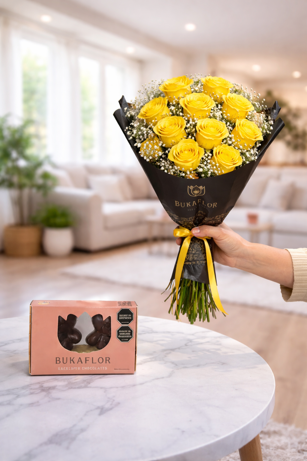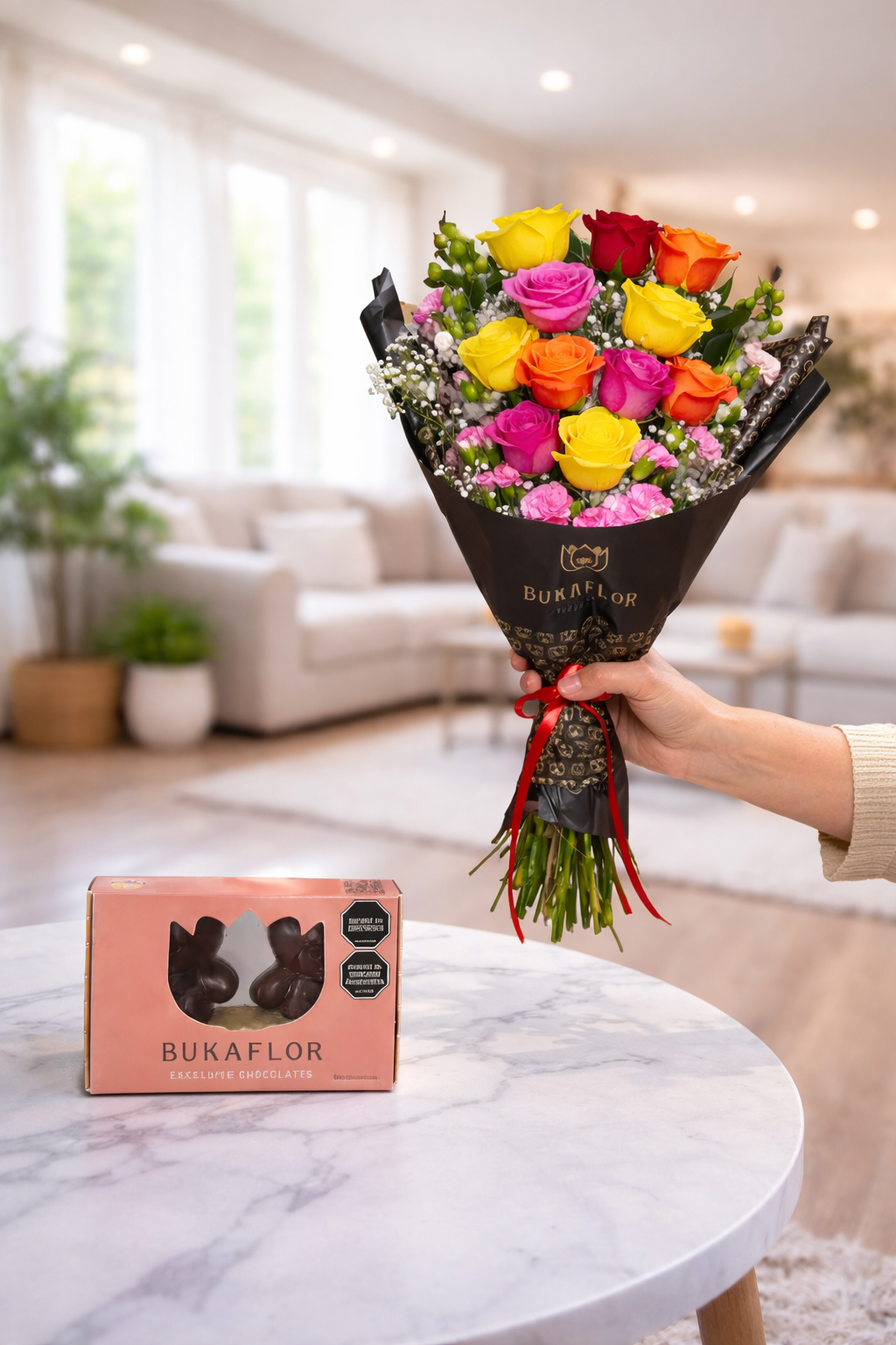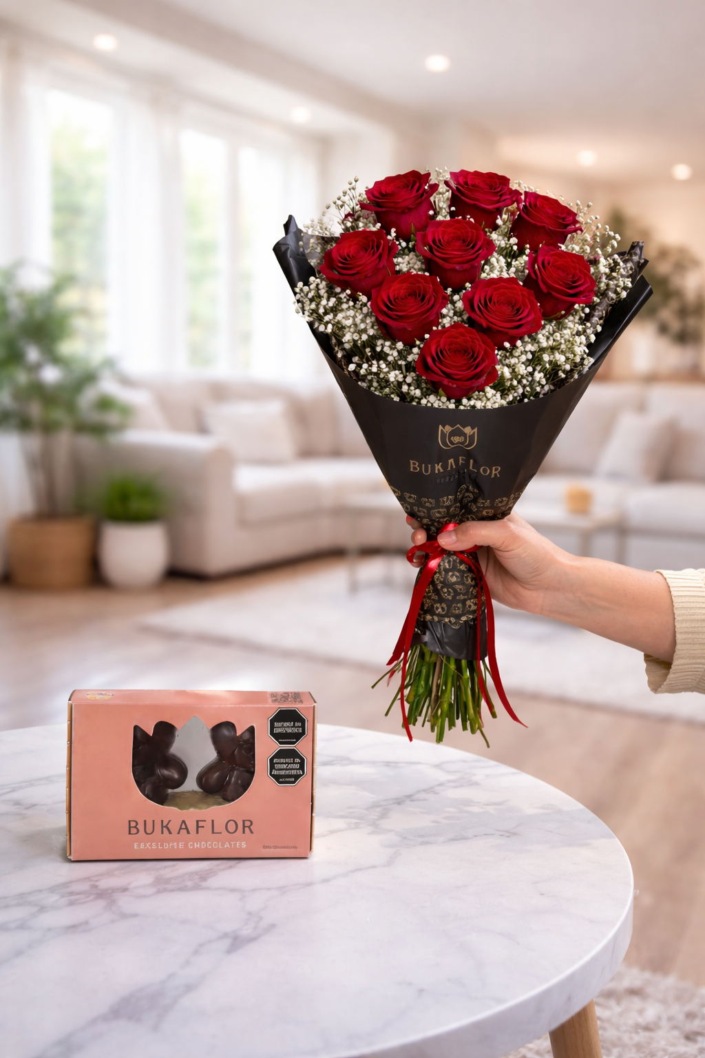 La manera más clásica de decir te amo, junto a unos deliciosos chocolates. Así se mata con dulzura a una dama. Este arreglo nos deja en un estado de enamoramiento con hermosas rosas recién cortadas de NUESTRO cultivo, que endulza con unos deliciosos ferreros rocher. Contiene: * 11 Rosas rojas. * caja de Choco – Bukkiteddys * Decoración con toques de Gipsófila. * Capucha floral y cinta de tela. * Vitaminas e instrucciones de cuidado de tus flores. ESCOGE TU COLOR FAVORITO O TE LLEGARÁ EN COLOR DISPONIBLE* Tarjeta GRATIS*