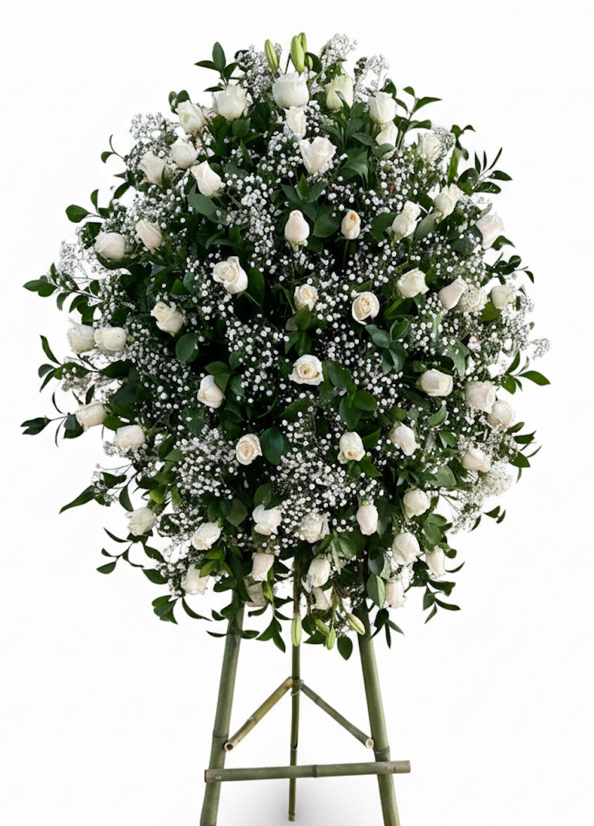 En momentos tan difíciles puede costar mucho encontrar las palabras adecuadas para expresarnos. Es por ello, que nos inspiramos para acompañar a seres queridos con un hermoso arreglo en rosas blancas, ideales para decir transmitir nuestros sentimientos, y recordarle a nuestros seres queridos que siempre estaremos para apoyarlos. Contiene: * 30 Rosas Blancas. * Decoración con toques de Gipsófila. * Pedestal en bambú. * Tarjeta GRATIS. Por favor, deje su contacto de WhatsApp para que podamos comunicarnos con usted y coordinar los detalles del arreglo funebre. Es importante para nosotros brindar un servicio oportuno y respetuoso, por lo que entregamos los arreglos funebres de inmediato, considerando que el tiempo en sala es limitado. Estamos comprometidos con brindar un servicio de alta calidad y sensibilidad en momentos difíciles.