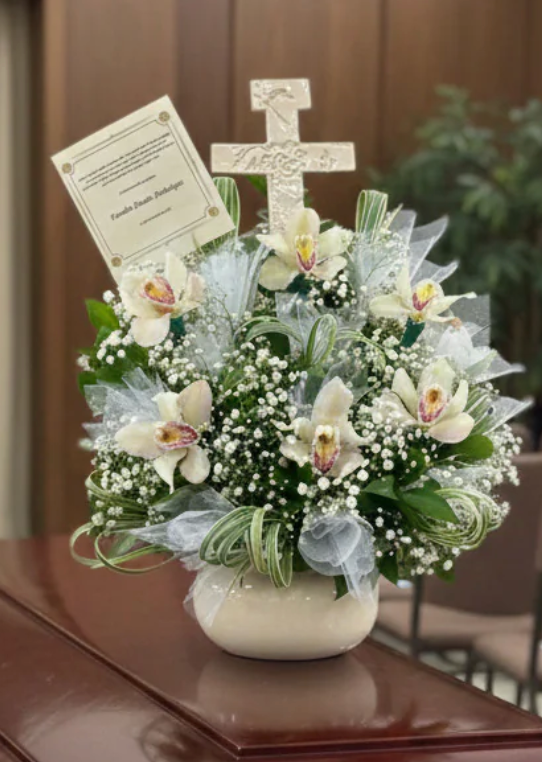 * 6 Orquídeas Cymbidium. * Caja de madera. * Cristo. * Decoración con toques de Gipsófila y tull. * Tarjeta GRATIS.