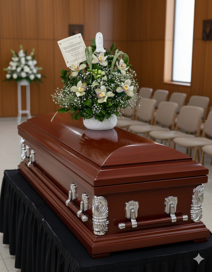 Nuestro arreglo del consuelo, un arreglo ÚNICO, diseñado simplemente para consolar a nuestros seres queridos. Por eso, entregar estas orquídeas en esos casos es algo habitual para ayudarles a reconfortar su pérdida. Existen muchísimas frases para dar el pésame. Tantas como los tipos de relación que podíamos tener con la persona fallecida. Esta es algo especial, para un ser demasiado amado. Adicional por su significado: Las orquídeas solo se obsequian a quienes uno amamos con el corazón. Contiene: * 6 Orquídeas Cymbidium. * Caja de madera. * Cristo. * Decoración con toques de Gipsófila y tull. * Tarjeta GRATIS.