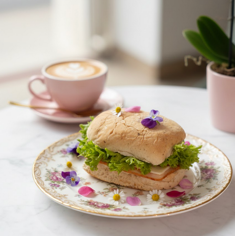 Experiencia Gourmet: Un sándwich de pollo premium servido en nuestra Mantequillera de cerámica artesanal y un Parfait de yogurt griego con fruta fresca presentado en una elegante Ánfora Bukaflor.