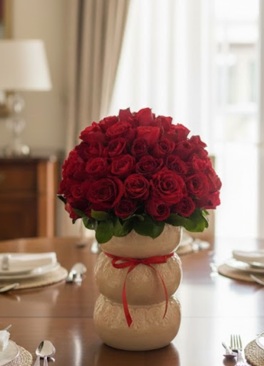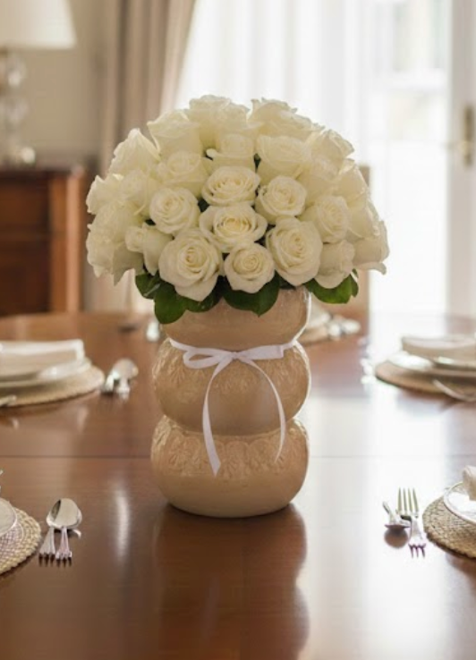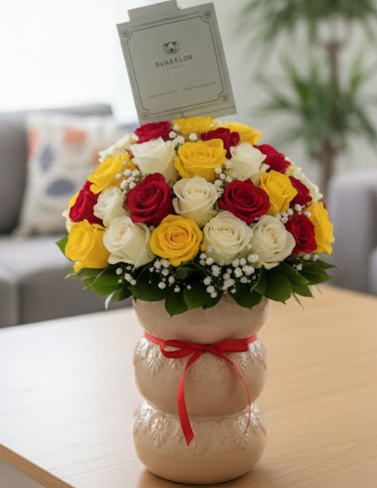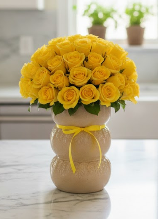Hermoso jarrón de cerámica clara y con una textura esculpida, es una pieza artesanal de diseño único, con  geométricos grabados que añaden un toque de encanto rústico y detallado. Contiene un ramo de aproximadamente veinte rosas en plena floración, destacando por su vibrante color dorado. Están adornadas con delicados ramilletes de gypsophila blanca y un follaje verde oscuro que realza su brillo, creando un conjunto de alegría y frescura.