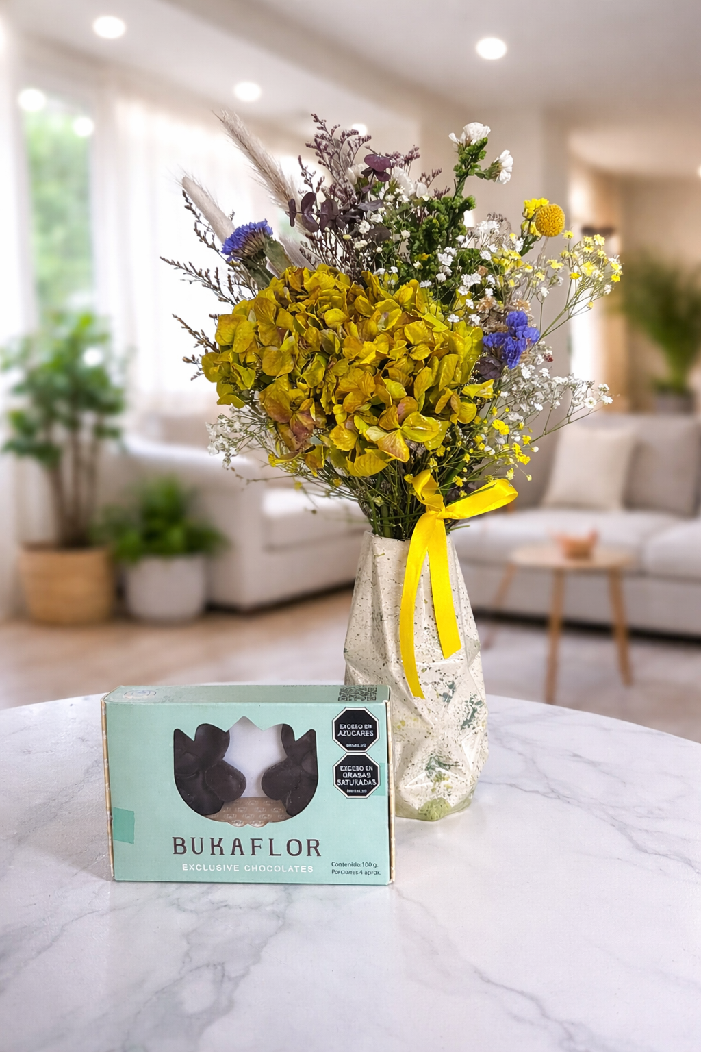 🌼✨ Un regalo que enamora los sentidos ✨🍫Un elegante jarrón rosado con crisantemos amarillos y blancos, símbolo del cariño sincero y alegría, acompañado de nuestros exclusivos chocolates Bukaflor. Te llegara flore de temporada.