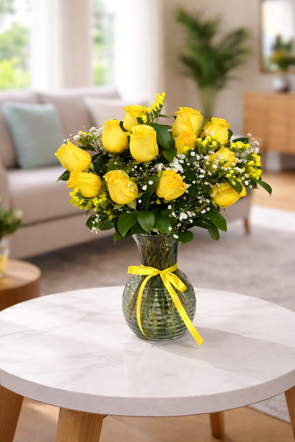 ¡Toda una vida contigo! 💛Rosas y lirios como símbolo de amor sincero, perfecto para expresar lo que sientes. Incluye:12 rosas amarillas o rojas según disponibilidad , follajes silvestres, gipsófila, florero de vidrio, cuidados y tarjeta GRATIS.