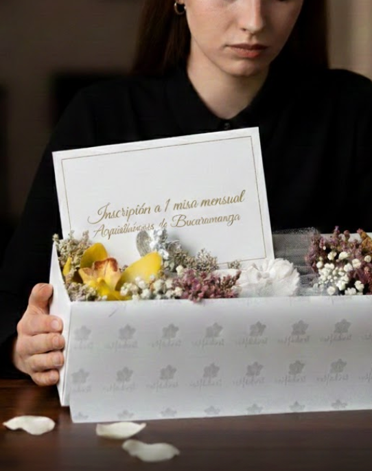 Nuestras cajas de liga de misa, tienen un hermoso detalle no solo por su belleza y delicadeza para quien las recibe, sino también por el significado de inscripción a quién fallece o tienen una petición, a una misa semanal que realizan la arquidiócesis de Bucaramanga. Es especial para decirle a alguien que lo acompañamos con el corazón. Contiene: * 1 Virgen 15 cm. * 2 rosas. * Decoración con Gipsófila y flores silvestres. * Liga de misa del arquidiócesis de Bucaramanga. * Caja de lujo. * Vitaminas e instrucciones de cuidado. * Tarjeta GRATIS.