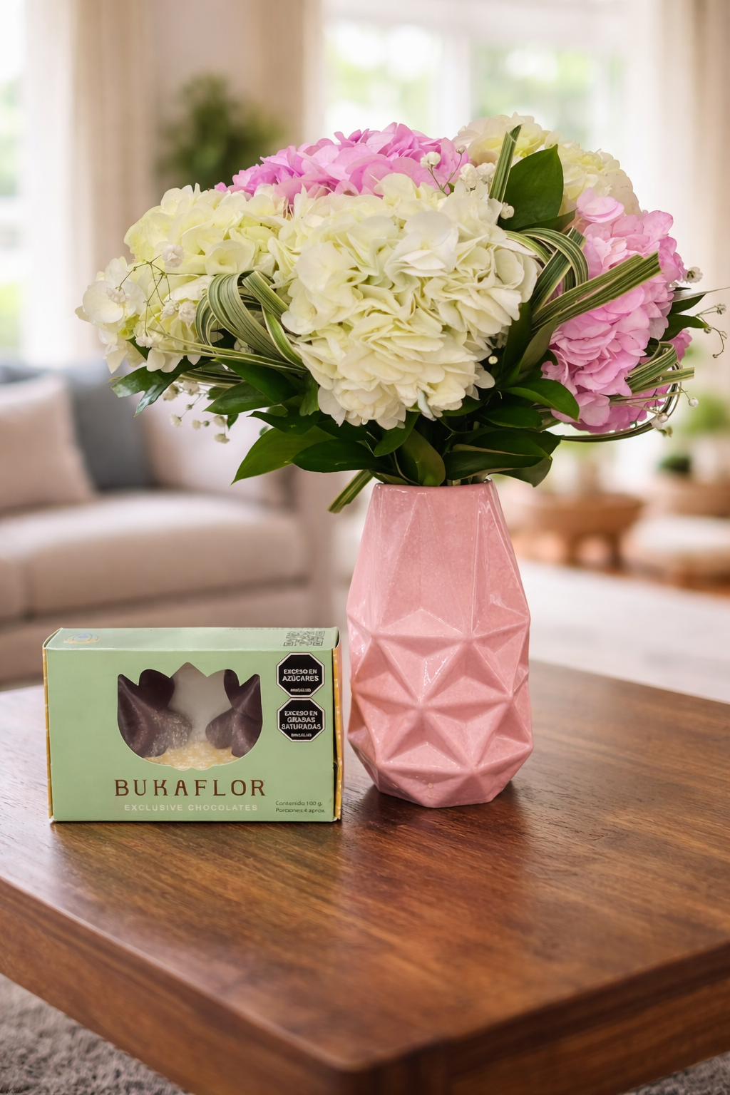 Incluye:Jarrón de cerámica, hortensias de colores (color a elección), flores de temporada, follajes, Chocolate premium bukaflor y tarjeta GRATIS.
